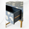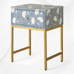 A blue bone inlay nightstand adds a pop of color, elegant artistry, and functional storage, instantly enhancing the luxury of any bedroom decor.